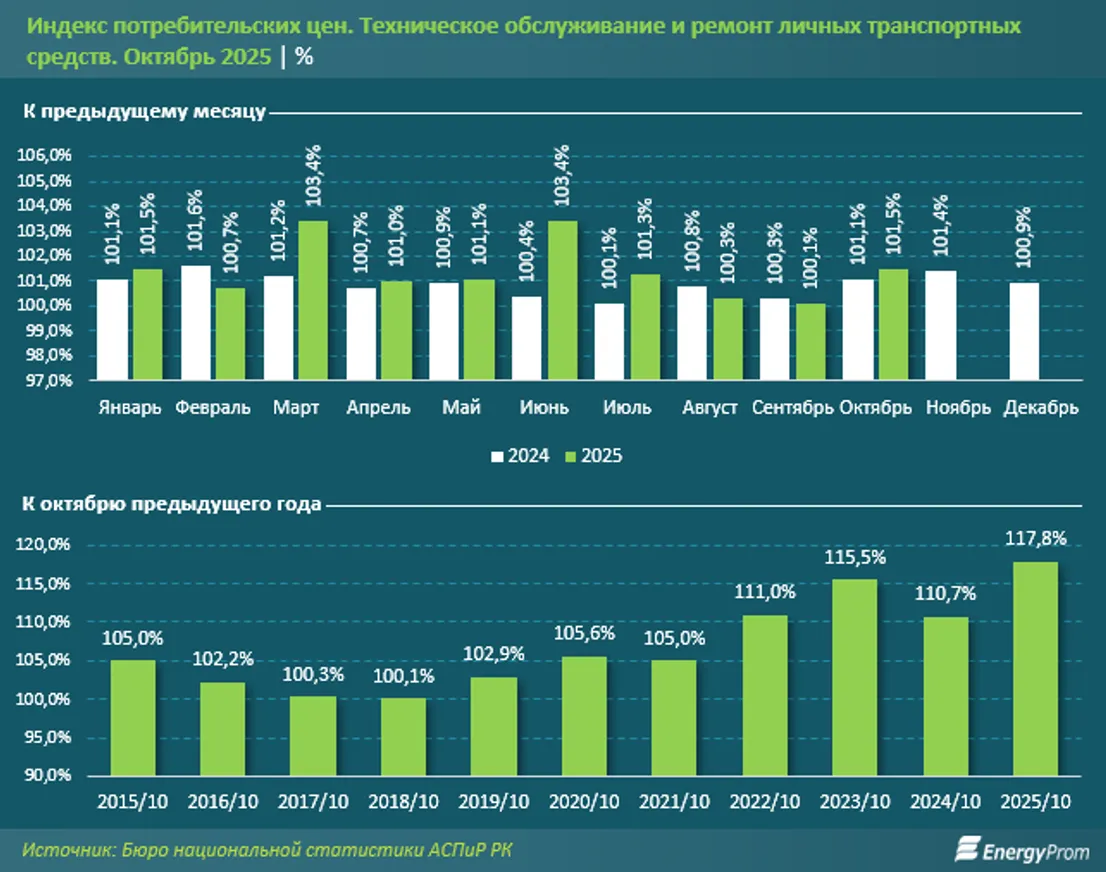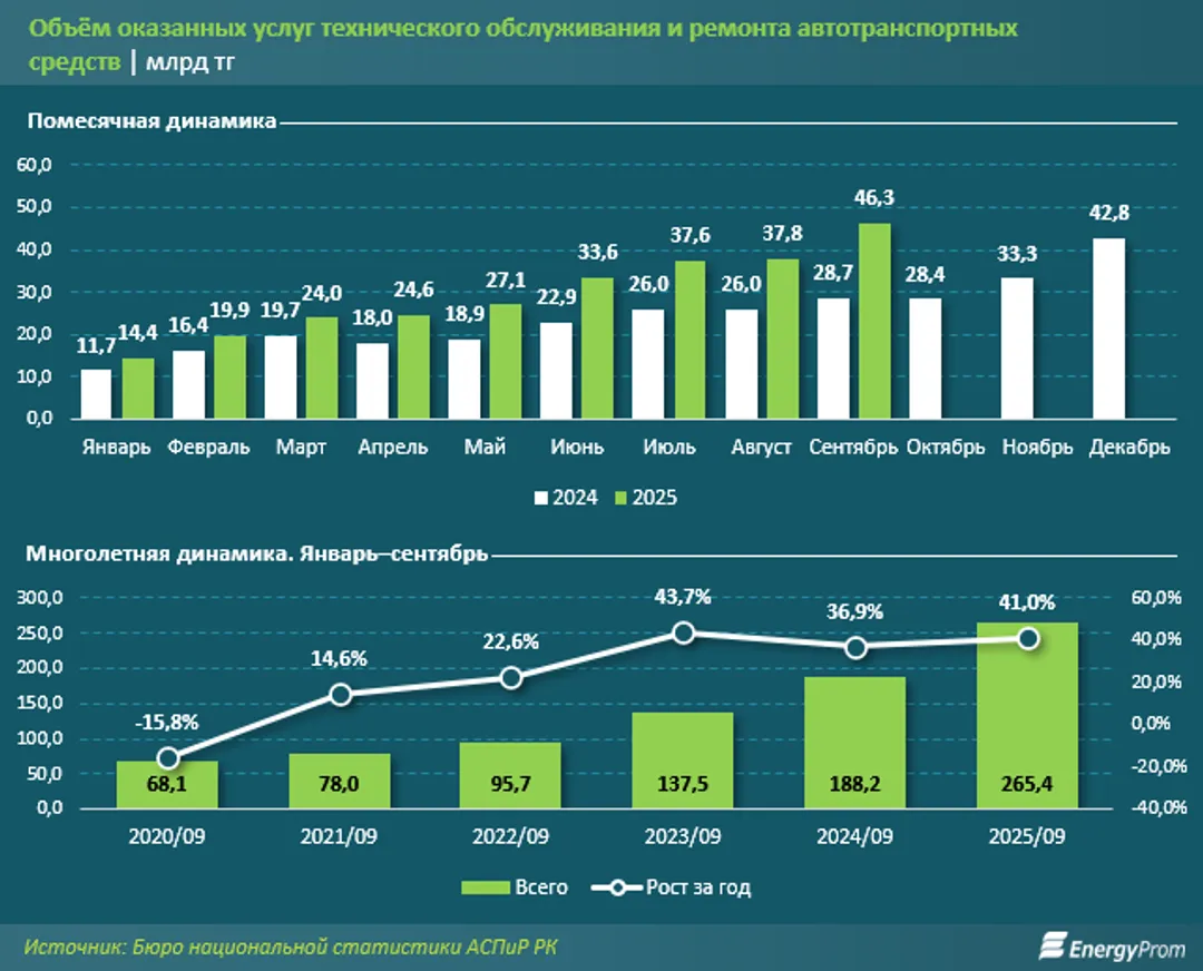 В сентябре 2025-го в Казахстане объём оказанных услуг по техническому обслуживанию (ТО) и ремонту автомобилей достиг 46,3 млрд тенге — на 22,5% больше в стоимостном выражении, чем месяцем ранее (ИФО — 122,3%), и сразу на 61,2% больше, чем в сентябре прошлого года (ИФО — 137,3%), сообщает energyprom.kz.