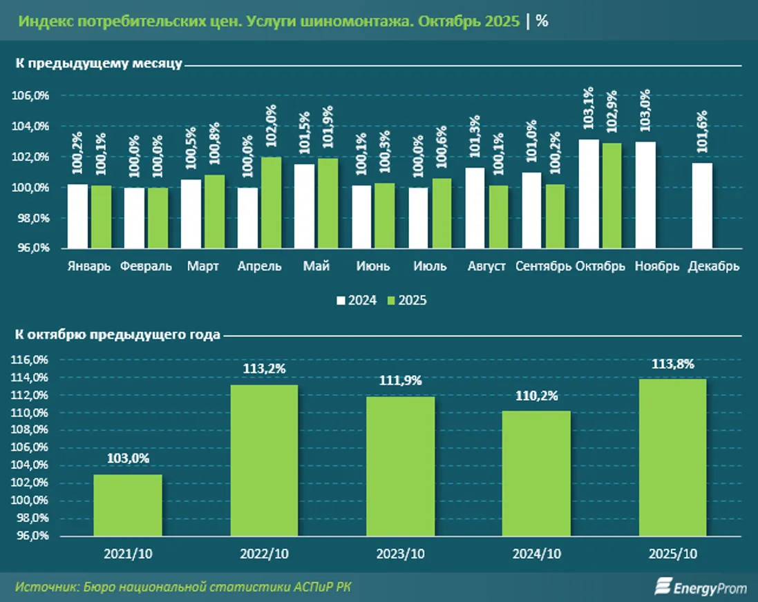 В региональном разрезе самый заметный рост цен на услуги шиномонтажа в октябре был отмечен в Астане, где сезон «переобувания» начался раньше, чем в Алматы: сразу на 28,9% за месяц. Существенное удорожание также было отмечено в Восточно-Казахстанской и Павлодарской областях: на 5,3% и на 4,9% соответственно.