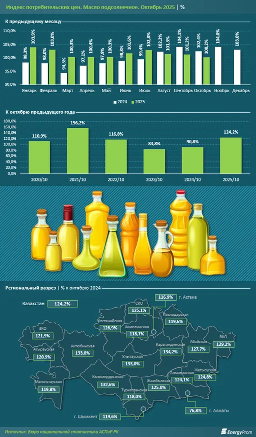 По итогам октября текущего года цены на подсолнечное масло в Казахстане выросли на 0,2% за месяц. Для сравнения: месяцем ранее было отмечено удорожание на 1,2%, а в октябре прошлого года — на 2,4%. Цены на подсолнечное масло растут уже 15 месяцев кряду, а самое заметное удорожание в текущем году наблюдалось в январе: сразу на 3,9%.