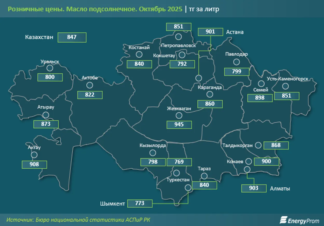 Средняя розничная цена литра подсолнечного масла в октябре 2025 года составила 847 тенге.