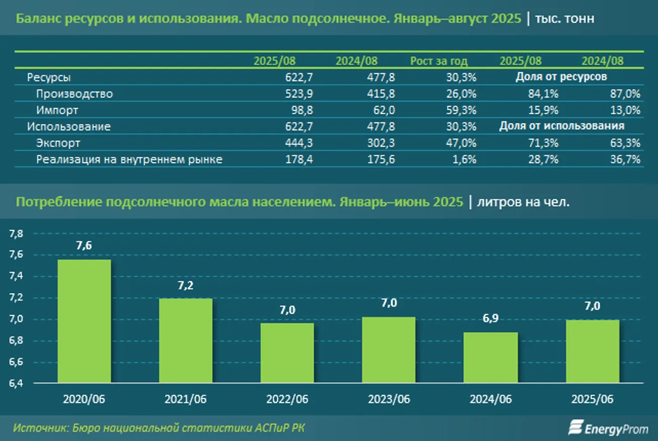 Увеличилось и потребление подсолнечного масла населением. Так, за январь–июнь текущего года каждый казахстанец в среднем потребил 7 литров подсолнечного масла — на 1,7% больше, чем за первое полугодие 2024-го. Годом ранее потребление подсолнечного масла сократилось на 2,1%.