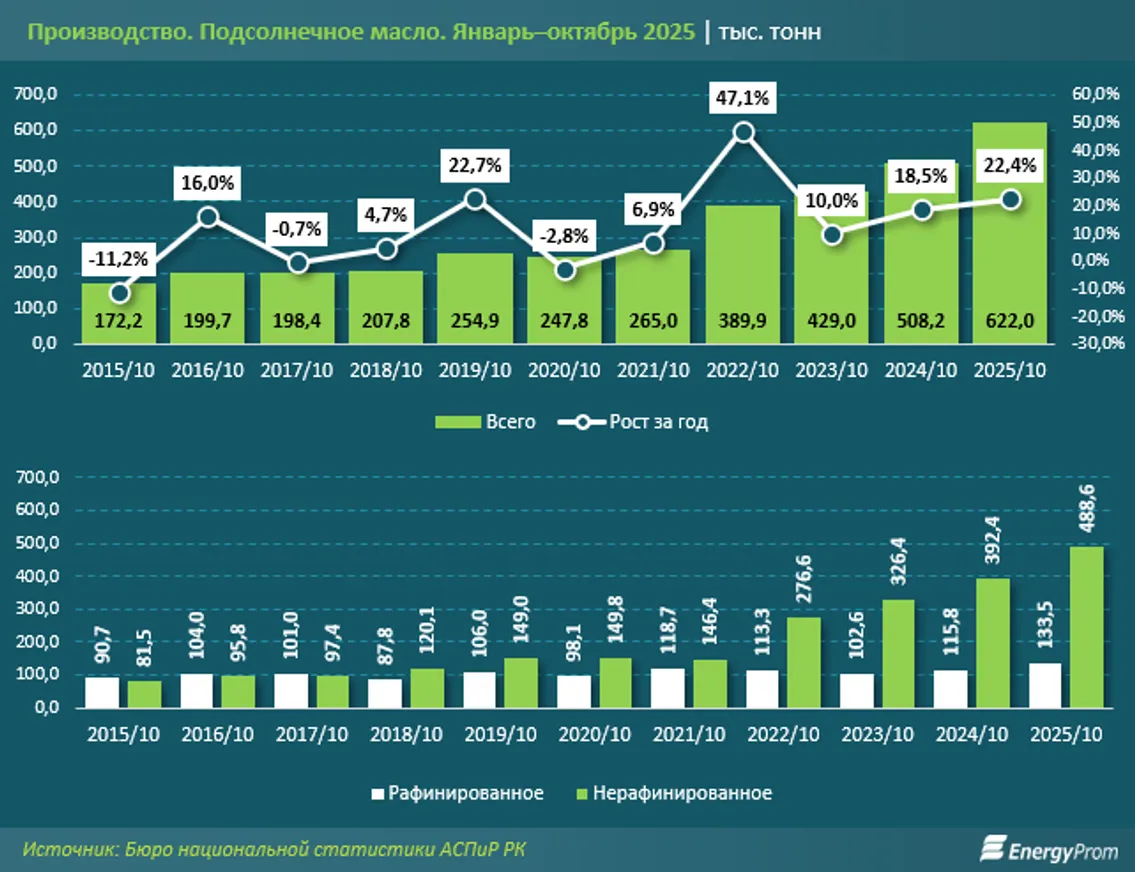 Производство подсолнечного масла в Казахстане растет пятый год подряд. Так, за январь–октябрь текущего года было выпущено 622 тыс. тонн подсолнечного масла — на 22,4% больше, чем за аналогичный период 2024 года. Годом ранее был отмечен рост на 18,5%, сообщает Energyprom.kz.