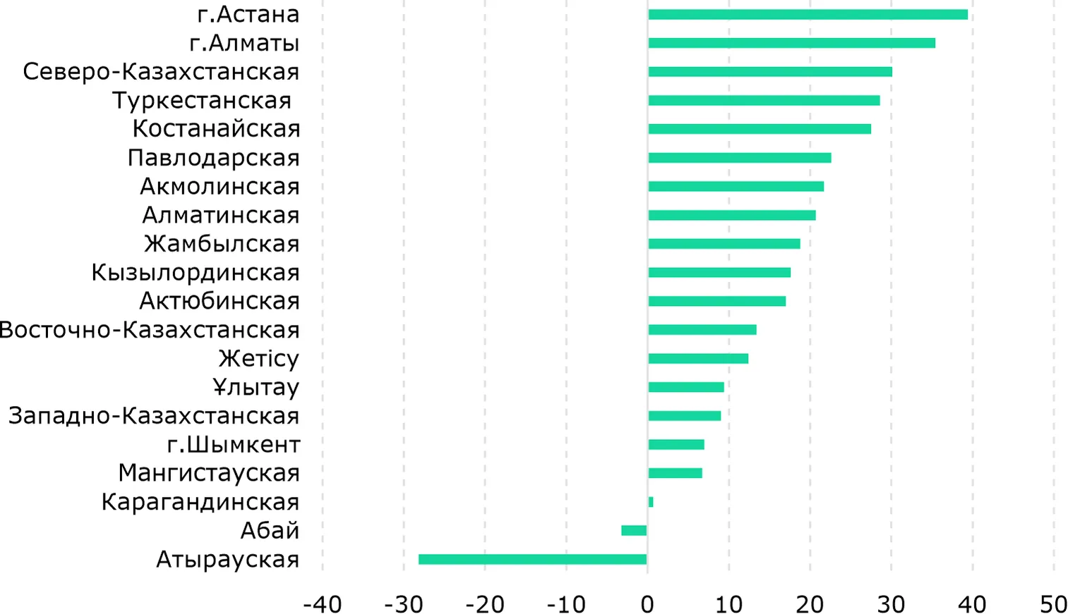 Региональная динамика строительного сектора остается неоднородной, в целом подтверждая высокую концентрацию активности в крупнейших мегаполисах и индустриальных областях. Максимальный вклад обеспечили Астана (1,09 трлн тенге; +39,4% г/г) и Алматы (707,0 млрд тенге; +35,4% г/г), формируя в совокупности почти 25% республиканского объема строительных работ. Среди областей выделяются Павлодарская (+22,6% г/г), Костанайская (+27,5% г/г) и Туркестанская (+28,6% г/г), регионы с ускоренным реализационным циклом инфраструктурных проектов, промышленной базой и активным жилищным строительством. Спад наблюдается в Атырауской области, где объем работ снизился на 28,2% г/г, отражая завершение крупных промышленных проектов (Рис. 2).