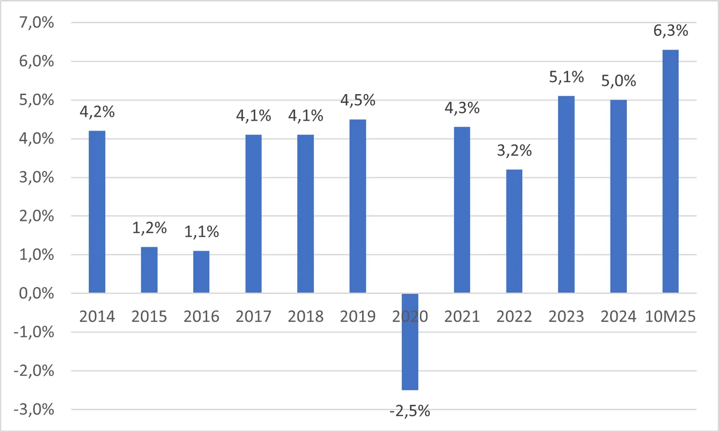ВВП Казахстана в предыдущие годы рос темпами примерно на 3% в год, как видно на графике. А вот в 2023 году реальный рост составил 5,1%, в 2024 году – 5%, а за 10 месяцев 2025 года достиг 6,4%. Из этого следует, что 2025 год стал особенным для экономики страны. В последний раз темп роста экономики был таким высоким в далеком 2011 году, когда он достигал 7,5% на фоне восстановления цен на нефть до 120 долларов за бочку. Теперь же нефть стоит лишь 65 долларов, но экономика показывает значительный рост, что объясняется рядом факторов.
