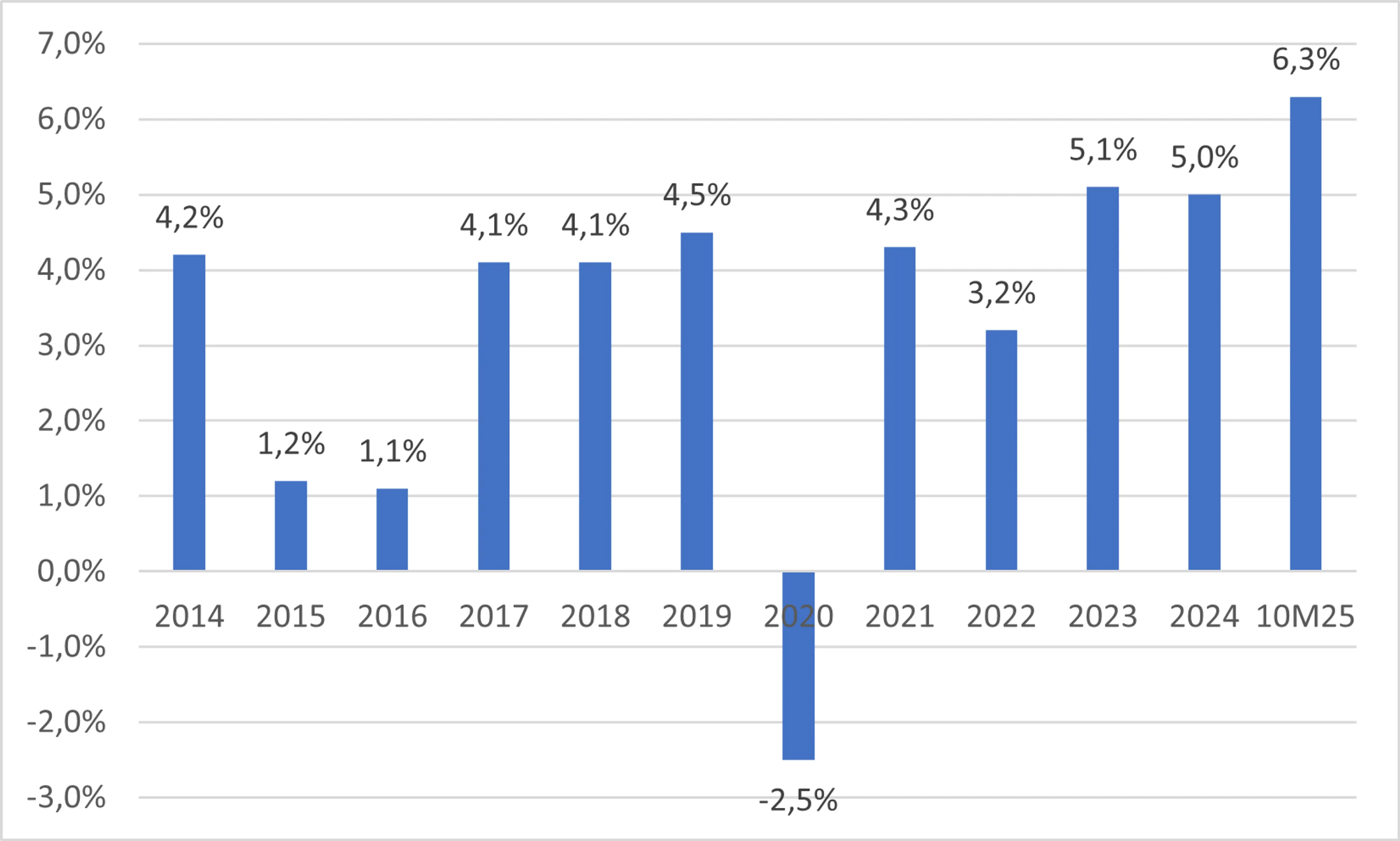 Динамика годового темпа роста ВВП Казахстана за 2014 – 10 мес. 2025 гг., % г/г
