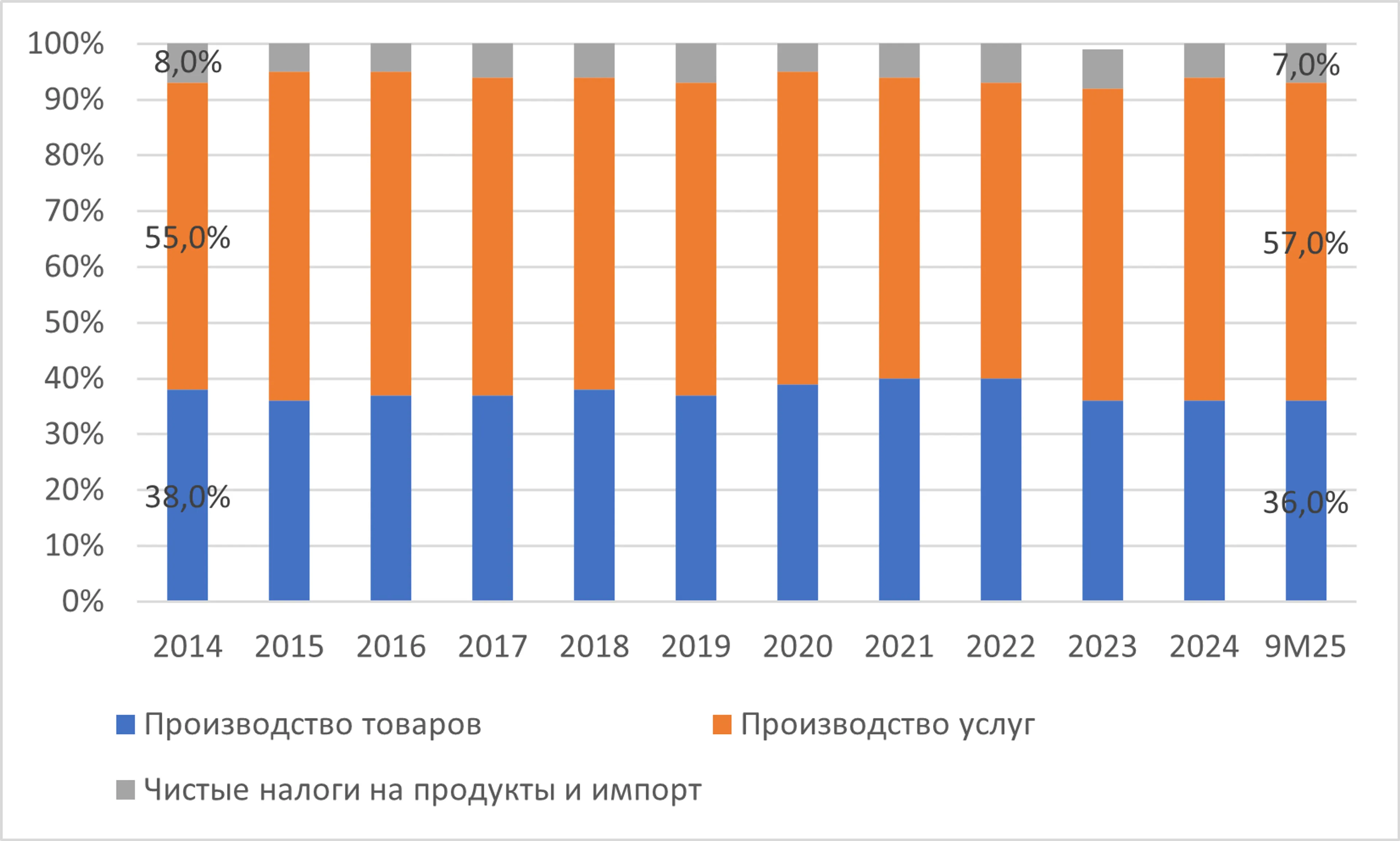 Динамика структуры ВВП Казахстана за 2014 – 9 мес. 2025 гг., %