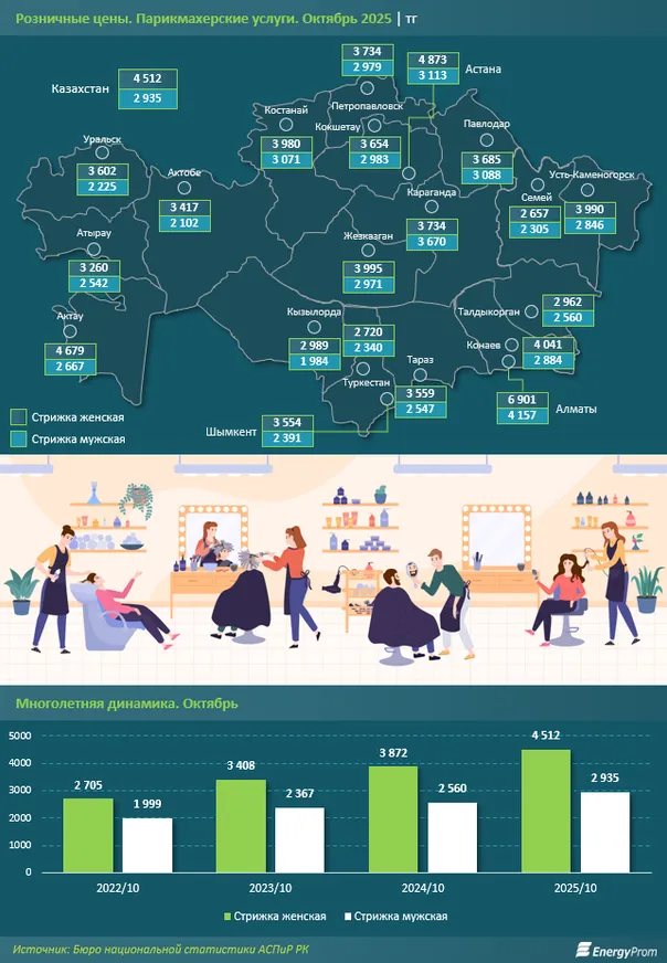 По итогам октября текущего года средняя розничная стоимость женской стрижки в Казахстане составила 4,5 тыс. тенге, мужской — 2,9 тыс. тенге. Среди городов РК дороже всего женская и мужская стрижки обходились в Алматы: 6,9 тыс. и 4,2 тыс. тенге соответственно. Высокие цены на женскую стрижку также наблюдались в Астане и Актау (4,8 тыс. и 4,6 тыс. тенге), на мужскую — в Караганде и Астане (3,7 тыс. и 3,1 тыс. тенге соответственно).