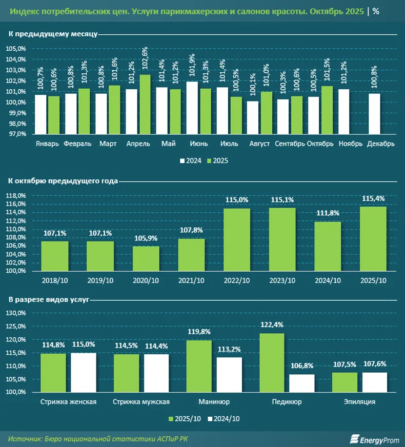 Цены на услуги парикмахерских и салонов красоты в Казахстане растут 47 месяцев подряд: они не снижались с начала ведения статистики в 2011 году. По итогам октября 2025-го услуги в секторе подорожали на 1,5% за месяц. В прошлом месяце был отмечен рост цен на 0,6%, а в октябре прошлого года — на 0,5%.