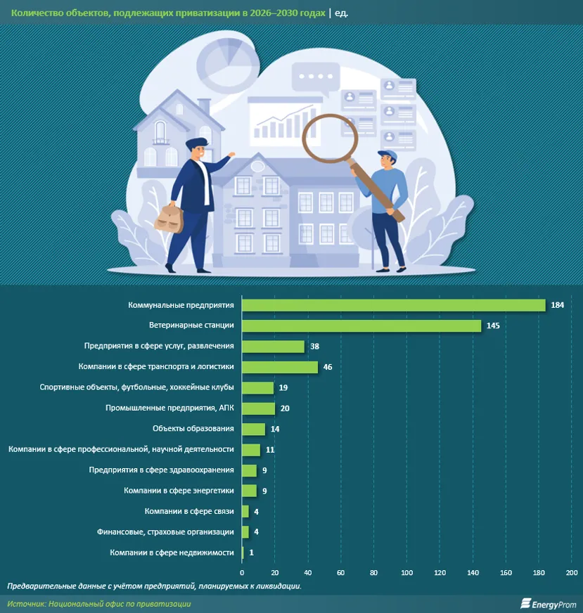 Новая волна приватизации будет проводиться в три этапа: 2026 год, 2027-2028 годы и 2029-2030 годы. Утвержденный перечень объектов приватизации состоит из 473 предприятий. Правда, на сайте Национального офиса по приватизации опубликован список из 504 объектов. Часть из них повторяется или имеет статус «подлежат ликвидации». Паспорта объектов пока не готовы.