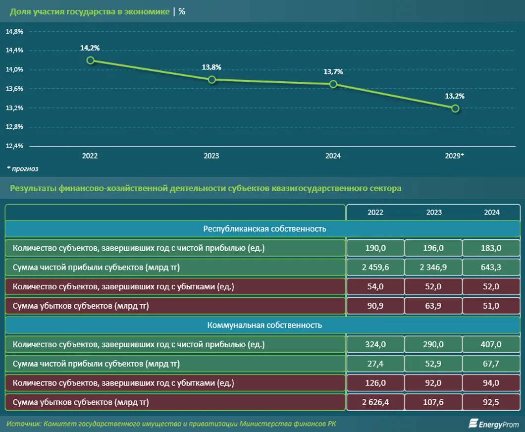 Как показывают данные Комитета государственного имущества и приватизации, с 2022 по 2024 год в стране уменьшилось (со 190 до 183) количество субъектов квазигосударственного сектора, находящихся в республиканской собственности, которые завершили год с прибылью. При этом общая сумма чистой прибыли сократилась в 4 раза, с 2,5 трлн до 643,3 млрд тенге. Количество компаний, закрывших прошлый год с убытками, осталось почти неизменным: чуть более 50. Однако общая сумма их убытков сократилась почти вдвое.