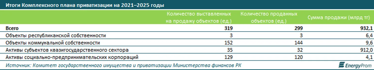 Согласно данным Комитета государственного имущества и приватизации, за этот период было выставлено для приватизации 319 объектов. Из них почти половина (152) пришлась на предприятия коммунальной собственности, а еще 129 — на активы социально-предпринимательских корпораций. В рамках кампании были проданы и переданы в доверительное управление 299 объектов. Общая сумма, полученная бюджетом за прошедшую волну приватизации, составила 932,1 млрд тенге. Большая часть всего объема — 912 млрд тенге — была получена за реализацию именно активов квазигосударственного сектора.