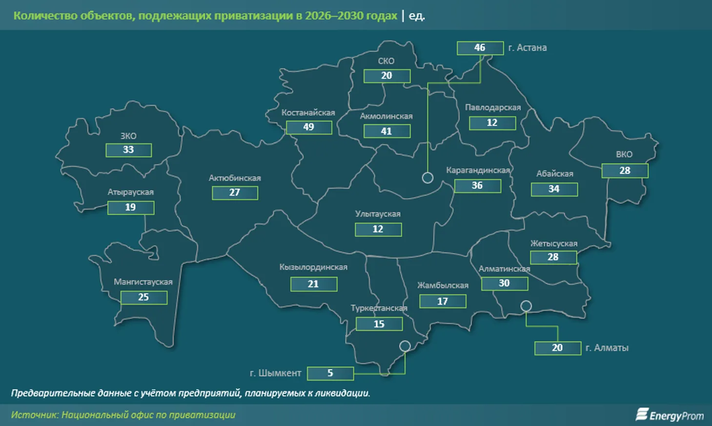 В региональном разрезе распределение неравномерно. Больше всего объектов придется на Костанайскую область (49), Астану (46) и Акмолинскую область (41). Практически в каждом регионе в числе приватизируемых предприятий обязательно есть коммунальные компании, которые отвечают за тепло- и водоснабжение.