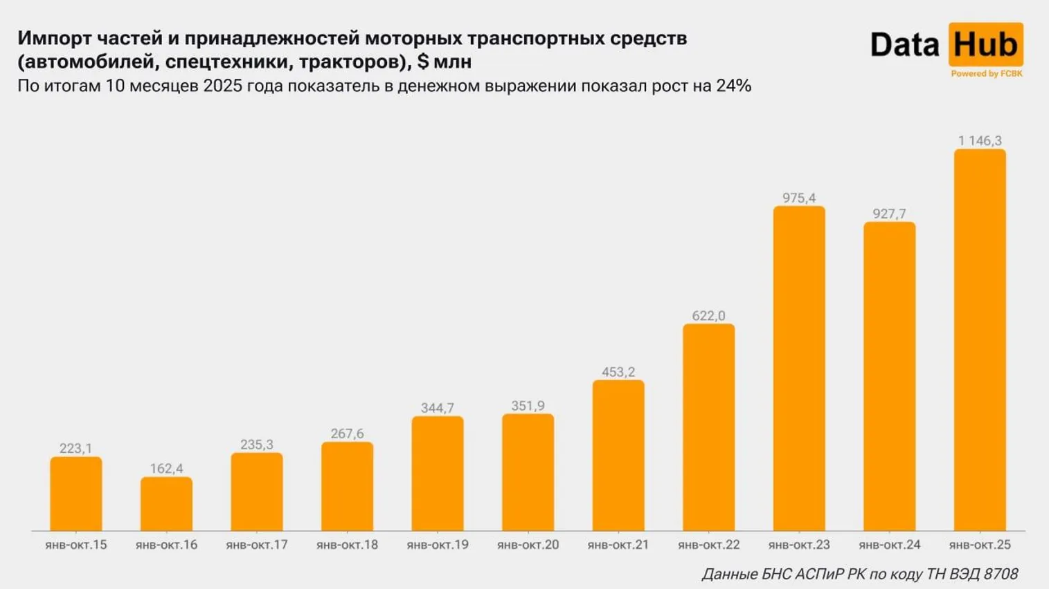 За январь-октябрь 2025 года объемы импорта частей и принадлежностей для различного рода транспортных средств* – легковых и грузовых машин, спецавтотехники, тракторов – превысили 1,1 млрд долларов, увеличившись на четверть в годовом выражении и достигнув максимума по крайней мере за последнее десятилетие, сообщает DATA HUB.