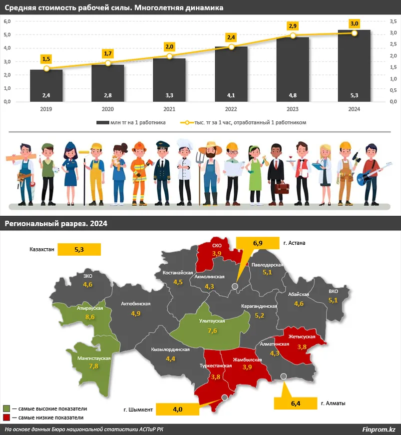 Сравнение данных в региональном разрезе в очередной раз подтверждает разные уровни экономического развития территории Казахстана. Наибольшие затраты на содержание рабочей силы наблюдаются в промышленно развитых и «нефтяных» областях. Например, в Атырауской области в прошлом году показатель составил 8,6 млн тенге, в Мангистауской — 7,8 млн тенге, в горнодобывающей Улытауской — 7,6 млн тенге. Наименьшие показатели были зафиксированы в регионах с низким уровнем развития экономики, ориентированных на сельское хозяйство и услуги. К примеру, в Туркестанской области затраты на рабочую силу составили всего 3,8 млн тенге. Аналогичный показатель в прошлом году наблюдался и в Жетысуской области.