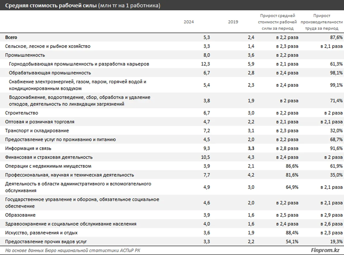 За последние несколько лет средняя стоимость рабочей силы в Казахстане выросла более чем в два раза. В прошлом году, по данным Бюро национальной статистики АСПиР (БНС) РК, она достигла 5,3 млн тенге на одного работника в год. Для сравнения: в 2019 году затраты работодателя на одного сотрудника составляли 2,4 млн тенге в год, приводят цифры в Finprom.kz.