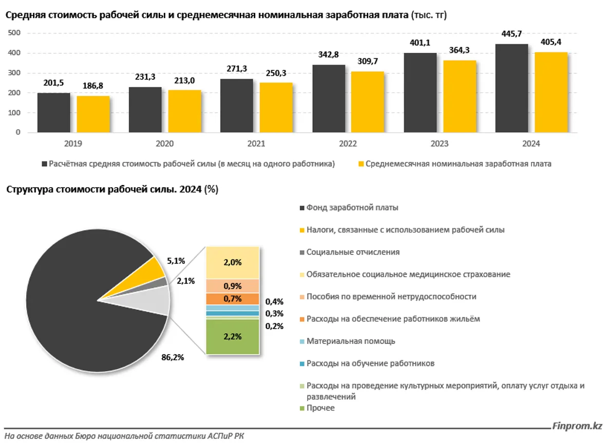 Ежегодное увеличение объема затрат работодателей на содержание рабочей силы зависит от нескольких факторов. Среди них индексация зарплаты, увеличение размера обязательных отчислений, введение различных видов расходов вне фонда заработной платы. Судя по многолетней статистике, в 2024-м рост средней стоимости рабочей силы составил всего 11,1%. Это минимальный показатель с 2019 года. Средняя стоимость одного часа, отработанного одним работником, в прошлом году составила 3 тыс. тенге — всего на 3,4% больше, чем в 2023-м. Такой прирост также можно назвать самым небольшим за последние годы.