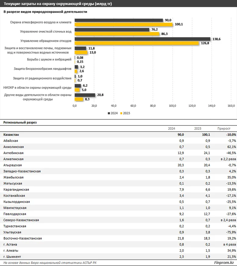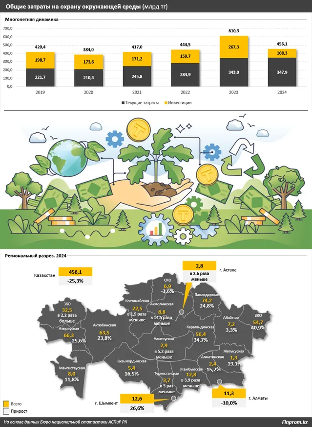 В Казахстане резко сократились затраты предприятий на охрану окружающей среды. По данным Бюро национальной статистики, по итогам 2024-го на эти цели было потрачено 456,1 млрд тенге — на 25,1% (или более чем на 150 млрд тенге) меньше, чем годом ранее (610,3 млрд тенге). Чтобы понять, почему сфера охраны природы недополучила так много денег, разобьем эти числа на слагаемые, пишет finprom.kz.