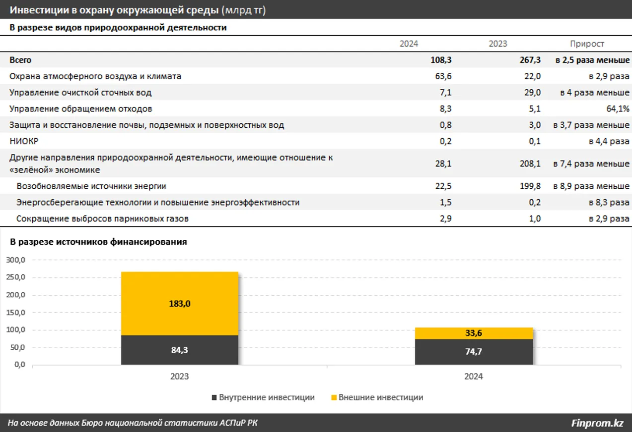 Общие затраты на охрану окружающей среды в Казахстане состоят из текущих расходов и инвестиций. С первым показателем в прошлом году все было более-менее ровно: текущие затраты хоть и незначительно (на 1,4%), однако все же увеличились. Итоговая сумма за 2024 год составила 347,9 млрд тенге. Что касается инвестиций, здесь наблюдался провал. За прошлый год объем вложений в охрану окружающей среды сократился в 2,5 раза: с 267,3 млрд до 108,3 млрд тенге. Чуть ниже обсудим причины.