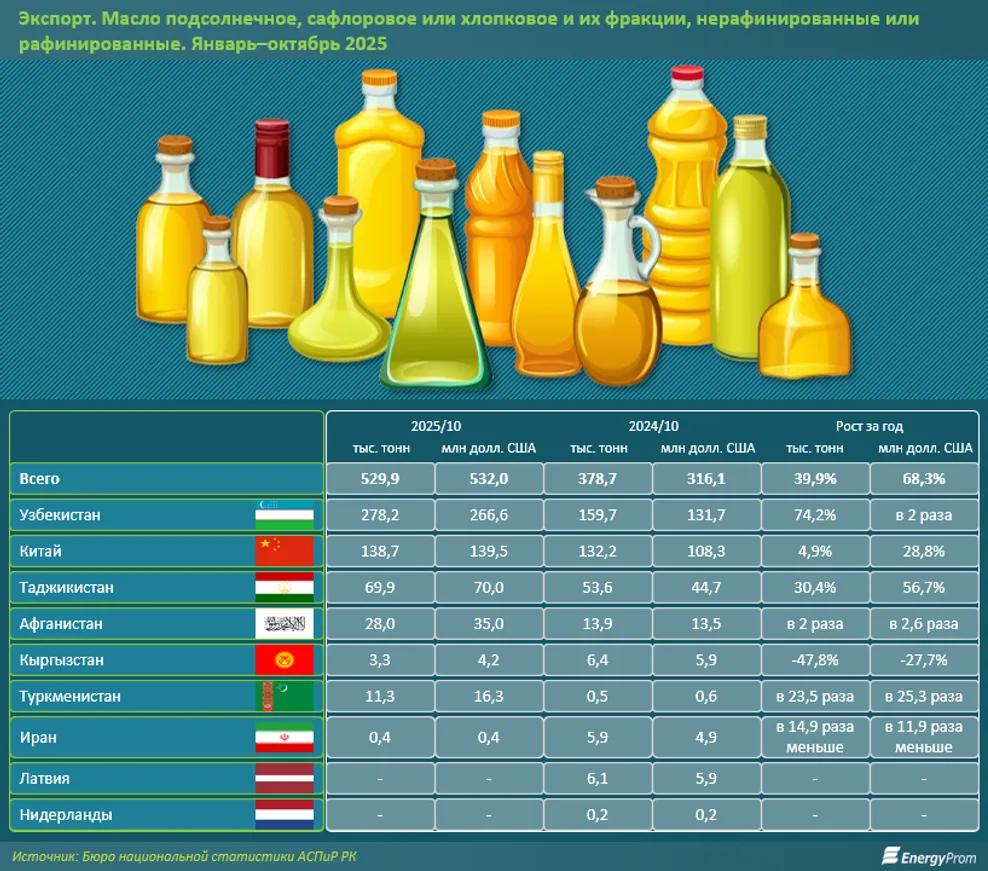 Довольно ощутимые сдвиги в продвижении этой казахстанской продукции на международных рынках начались еще в 2022 году, когда экспорт вырос почти в три раза. Тогда отечественные производители начали выходить на китайский рынок. В 2023-м казахстанские поставщики продали за рубеж на 58,9% больше, в 2024-м — еще на 30,6% больше подсолнечного масла. Динамика экспортных поставок в текущем году тоже была выразительной: плюс 44%.