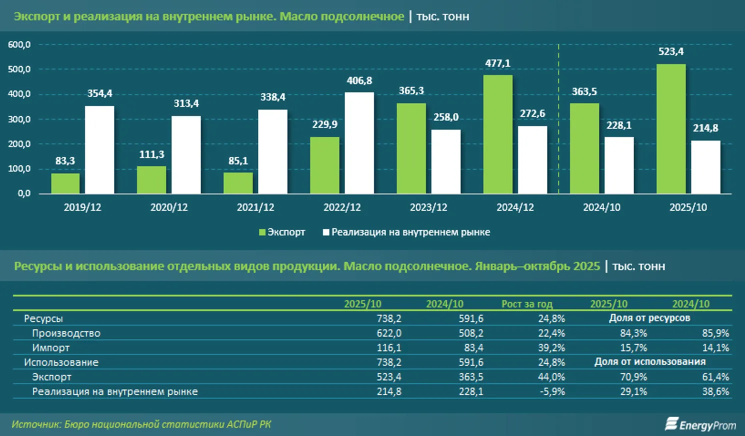 Нельзя утверждать, что из-за растущего экспорта казахстанцам не хватает масла. Однако доля импорта в ресурсах стала увеличиваться: если за десять месяцев прошлого года она составляла 14,1%, то за аналогичный период 2025-го достигла 15,7%. За январь–октябрь текущего года в Казахстан завезли 116,1 тыс. тонн подсолнечного масла — на 39,2% больше, чем за аналогичный период 2024-го. К слову, объем импорта теперь составляет более 50% от реализации на внутреннем рынке. Не исключено, что часть заграничного масла перепродаётся в другие страны.