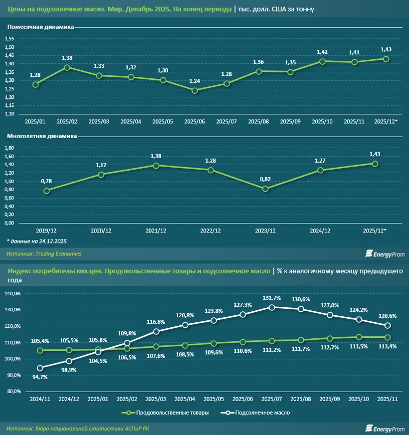 Данные международного портала Trading Economics дают обоснование заинтересованности казахстанских поставщиков в международной торговле. Согласно помесячной динамике, с июня по декабрь текущего года стоимость тонны подсолнечного масла выросла на 15,2%, достигнув максимального уровня в 1,4 тыс. долларов. Многолетняя динамика позволяет сделать вывод, что этот максимум — рекордный уровень не только в 2025-м, но и за последние пять лет.