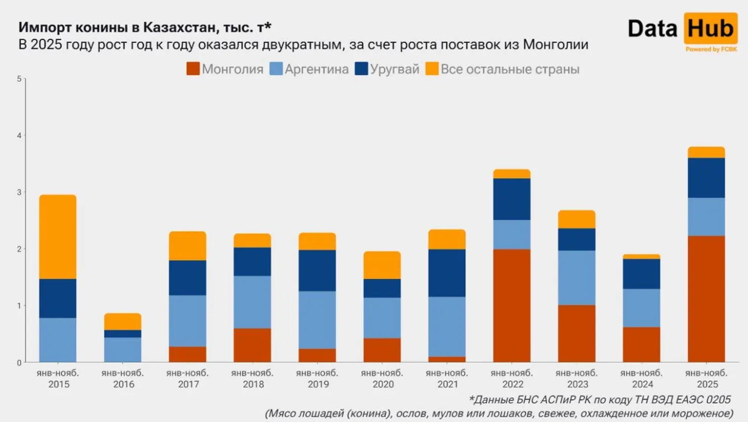 «По итогам 11 месяцев 2025 года в страну было ввезено 3,8 тыс. тонн на сумму 10,7 млн долларов – показатели оказались соответственно на 100% и 119% больше уровней аналогичного периода прошлого года. Речь при этом идет суммарно о свежем, охлажденном и замороженном мясе. Правда, теоретически объемы могут включать в себя не только конину, но и мясо ослов или мулов. Классификация товаров не позволяет выделить конкретно мясо лошадей, но вероятно, в нашем случае речь идет все-таки преимущественно о нем», - пояснили аналитики.