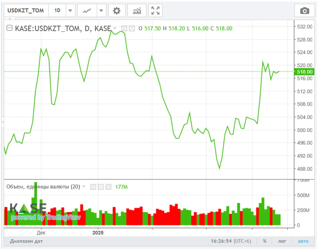 На текущий момент (10:26) валютная пара USD/KZT торгуется на уровне 519 тенге за доллар.