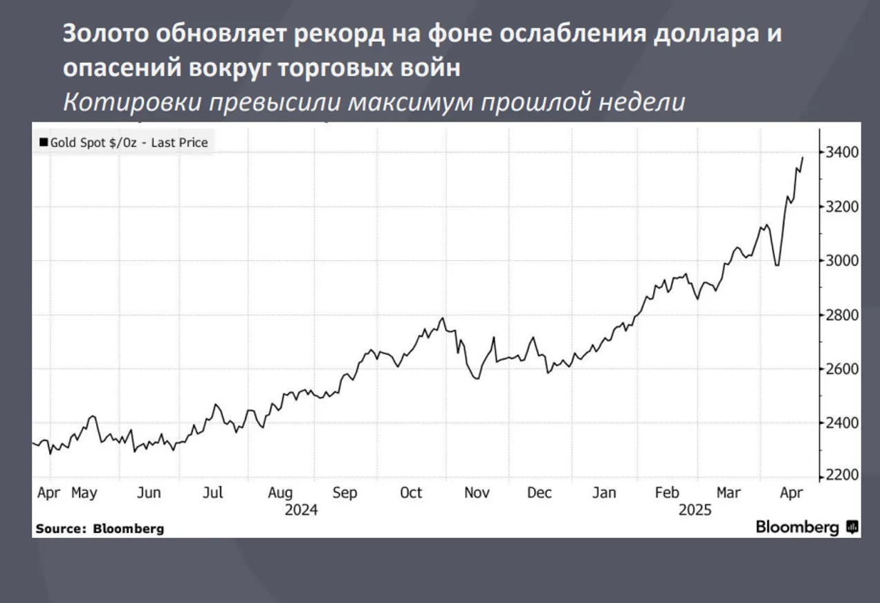 В результате золото продолжило стремительный рост, прибавив еще 2,26% за день и 5,49% за неделю, преодолев отметку 3 400 долларов за унцию. Это отражает явный спрос на защитные активы в условиях геополитической и макроэкономической турбулентности.