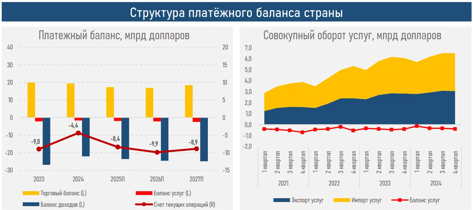 Поддерживаемый высоким ростом экспорта совокупный оборот внешней торговли услугами Казахстана в 2024 году достиг исторического максимума — 24,9 млрд долларов (+8,2% г/г), что благотворно сказывалось на динамике ВВП и валютном рынке.