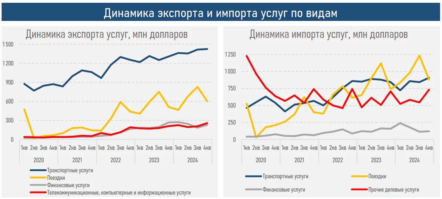 Наиболее значимыми направлениями экспорта остались транспортные услуги (47% экспорта), поездки (21%) и финансовые услуги (8%). В частности, экспорт финансовых и страховых услуг увеличился на 123,9 млн долларов (+12%) по сравнению с 2023 годом и составил 1,2 млрд.