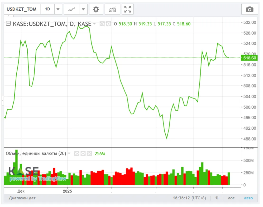 По итогам валютных торгов в среду курс USD/KZT повысился до отметки 518,38 тенге за доллар (+0,19 тенге). Несмотря на рост нефтяных котировок в ходе торговой сессии, нацвалюта немного ослабла — преимущественно под воздействием внутренних факторов — увеличения расчётов по импортным контрактам на фоне ускорения освоения бюджетных средств, а также необходимости обслуживания внешнего долга (выплаты по внешнему долгу страны в текущем квартале составят 10,6 млрд долларов). Дополнительное давление на тенге оказывают сохраняющееся геополитическое напряжение между Китаем и США, внешняя неопределённость, а также ослабление российского рубля.