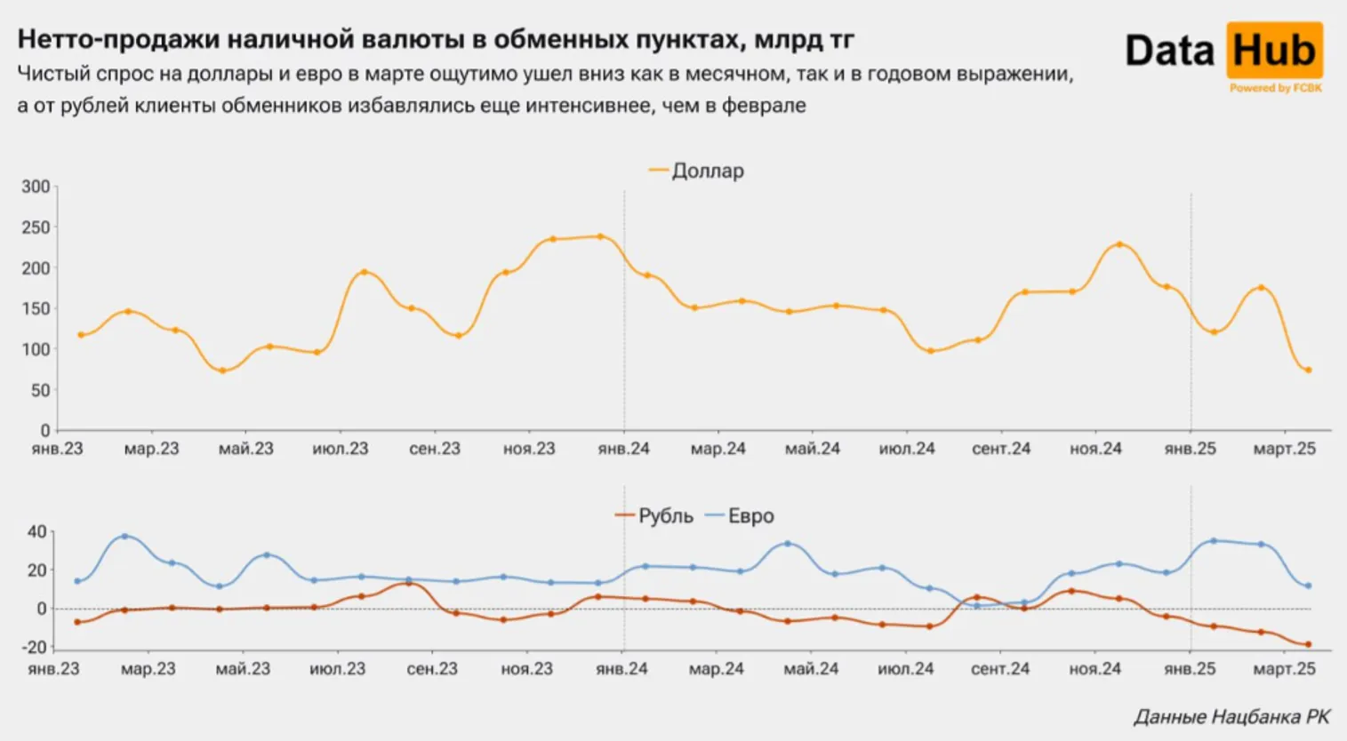 Спрос на евро также упал: в месячном выражении сразу на 65%, в годовом – на 39% номинально, до 11,6 млрд тенге. «Но здесь уже об особенных минимумах говорить не приходится, ниже, чем сейчас, нетто-продажи последний раз были относительно недавно – в августе-сентябре 2024 года. Курс евро, кстати, в марте, наоборот, был выше, чем в феврале (536,6 тенге, +1,9%)», - поясняют в ПКБ.