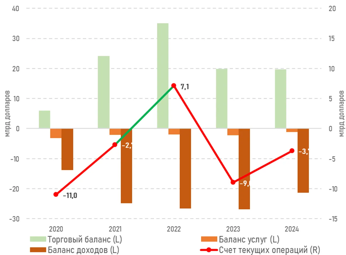Счет текущих операций сложился с дефицитом в $3,7 млрд в 2024 году