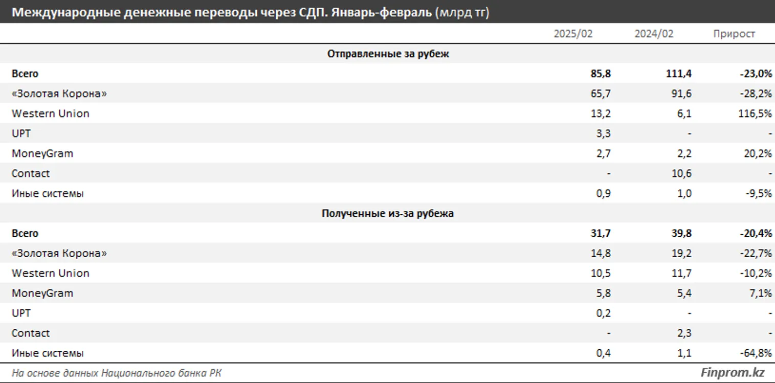 Среди международных систем денежных переводов лидировала «Золотая Корона». Так, объём отправленных за рубеж через эту СДП денежных переводов физических лиц за январь-февраль 2024 года составил 65,7 млрд тенге, а объём полученных из-за рубежа — 14,8 млрд тенге. При этом «Золотая Корона» теряет свою долю на рынке: объём отправленных за рубеж денежных переводов за год сократился на 28,2%, а их удельный вес уменьшился с 82,2% до 76,7%; объём полученных из-за рубежа средств сократился на 22,7%, а их удельный вес уменьшился с 48,2% до 46,8%.