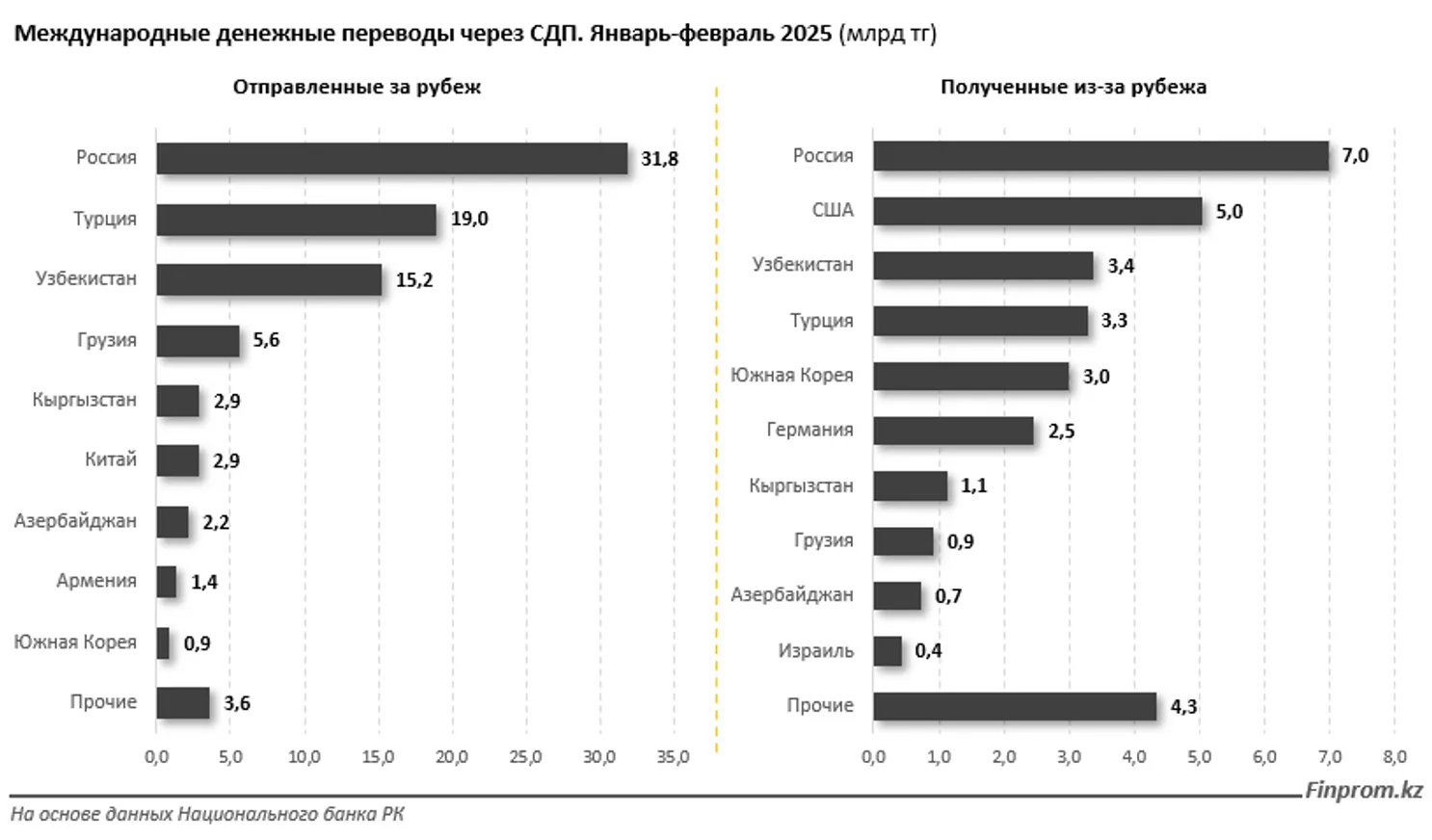 В разрезе стран наибольшие объёмы как отправленных за рубеж, так и полученных из-за рубежа средств за январь-февраль 2025 года пришлись на Россию: 31,8 млрд и 7 млрд тенге соответственно. По объёму отправленных за рубеж денежных переводов второе место заняла Турция (19 млрд тенге), а по объёму полученных из-за рубежа — США (5 млрд тенге). Узбекистан замкнул топ-3 стран как по объёму отправленных за рубеж денежных переводов, так и по объёму полученных из-за рубежа средств: 15,2 млрд и 3,4 млрд тенге соответственно.