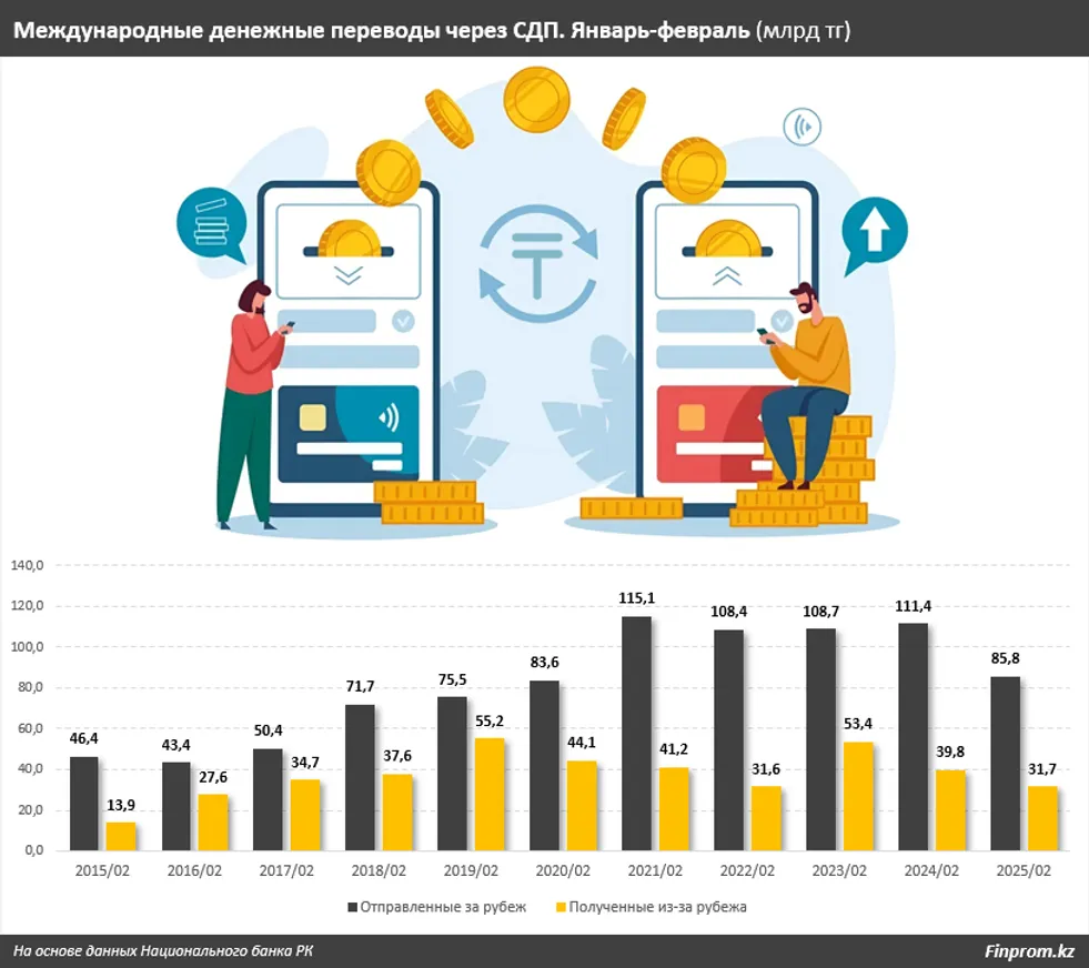 Объём международных денежных переводов физических лиц через системы денежных переводов (СДП) в РК за январь-февраль текущего года составил 117,4 млрд тенге — сразу на 22,3% меньше, чем за аналогичный период 2024-го. Годом ранее также наблюдался спад: на 6,8%. Большая часть международных переводов через СДП пришлась на отправленные за рубеж: 85,8 млрд тенге за январь-февраль 2025 года — на 23% меньше, чем годом ранее. На полученные из-за рубежа денежные переводы через СДП пришлось 31,7 млрд тенге — на 20,4% меньше, чем за январь-февраль прошлого года, пишет finprom.kz.
