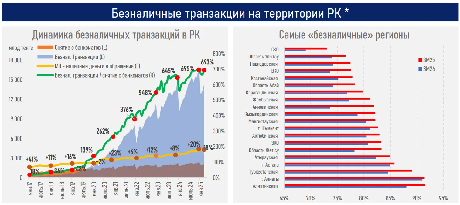 Развитие платёжной системы продолжает демонстрировать высокую динамику, чему способствуют усиливающаяся конкуренция за клиента, активный приток инвестиций в цифровую инфраструктуру, а также трансформация потребительского поведения. Страновой уровень проникновения безнала на начало апреля 2025 года достиг отметки 87,1% (85,5% годом ранее), а объёмы безнала теперь превышают соответствующие показатели операций по выдаче наличности в 6,8 раза (40,3 трлн vs 6,0 трлн тенге).