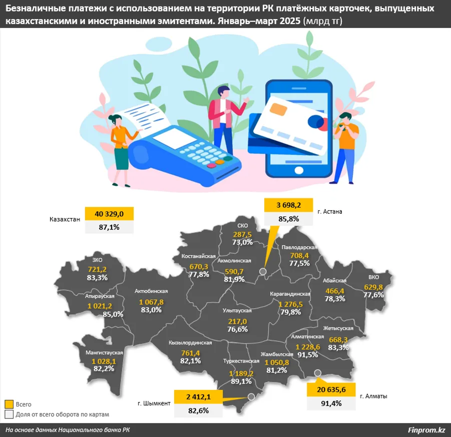 В региональном разрезе более половины безналичных платежей с использованием платежных карточек, выпущенных казахстанскими и иностранными эмитентами, пришлось на финцентр, Алматы: 20,6 трлн тенге. Следом идут мегаполисы Астана и Шымкент: 3,7 трлн и 2,4 трлн тенге соответственно.