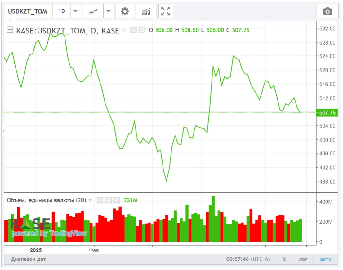 По итогам валютных торгов в четверг курс USD/KZT снизился на 3,75 тенге – до 507,00 тенге за доллар. При этом объём торгов умеренно вырос – до 230,5 млн долларов против 209,4 млн долларов на предыдущей сессии. С учётом в целом неблагоприятного внешнего фона (одновременное падение нефтяных котировок и рост индекса доллара во время торговой сессии), укреплению курса нацвалюты, вероятно, в большей степени способствовали внутренние факторы. Поддержку тенге мог по-прежнему оказывать перевес предложения инвалюты со стороны Нацбанка, экспортеров и КГC над спросом на неё со стороны предприятий и населения.