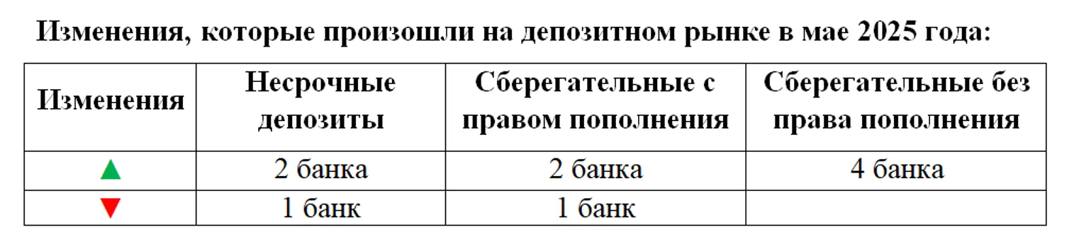 На сайтах шести банков размещено предложение о приеме срочных депозитов с правом пополнения. В мае 2025 года изменений по ставкам вознаграждения по срочным депозитам не происходило. На сайтах банков отсутствует информация о привлечении срочных депозитов без права пополнения.