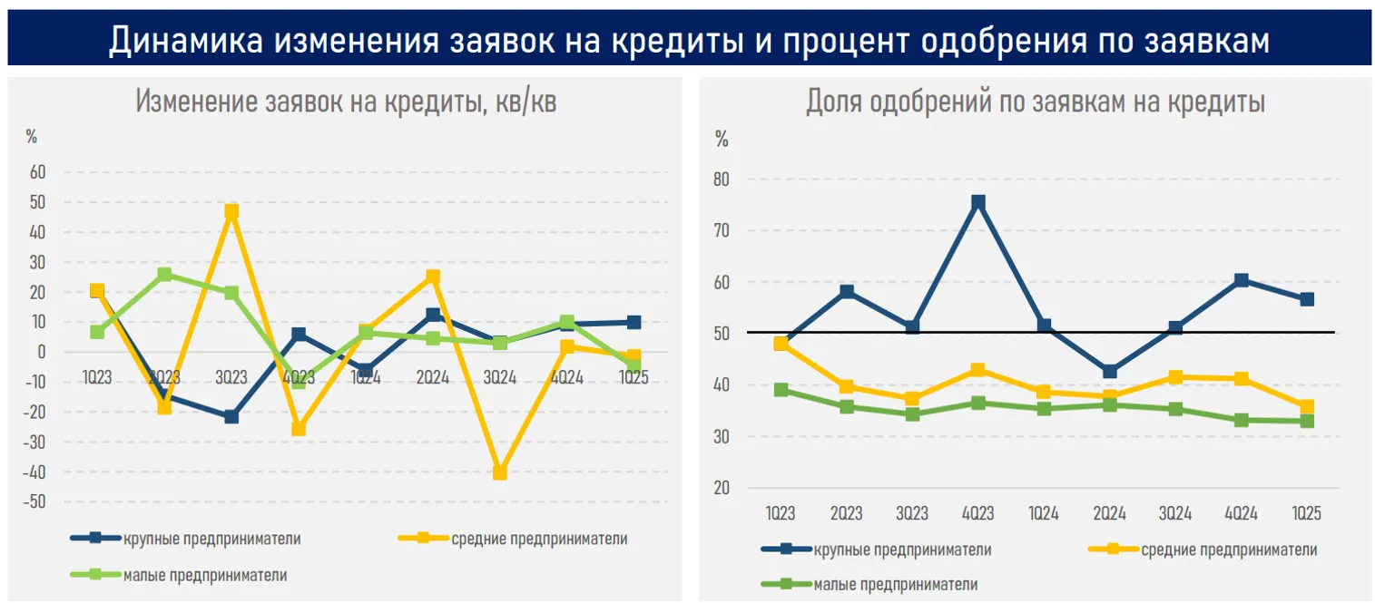 - В первом квартале текущего года общее количество кредитных заявок от субъектов предпринимательства увеличилось на 12% в годовом выражении (+43% к 3М24). Рост был обеспечен увеличением спроса со стороны малого (+12% г/г) и крупного бизнеса (+39%), что компенсировало снижение активности в сегменте среднего бизнеса (-25%). В результате прирост общей выдачи новых займов бизнесу замедлился до 4,7% в сравнении с увеличением на 33,1% в аналогичном периоде 2024 года.