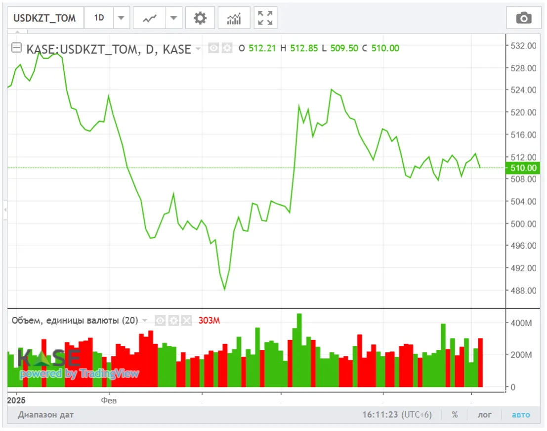 Валютная пара USD/KZT на биржевых торгах среды колебалась в узком боковом коридоре 510-512 тенге за доллар, что может являться результатом выжидательной позиции игроков рынка перед оглашением заседания по базовой ставке. По итогам дня курс по паре USD/KZT составил 511,30 тенге за доллар (-0,84 тенге). При этом объём торгов вырос до 302,7 млн долларов (+64,2 млн).