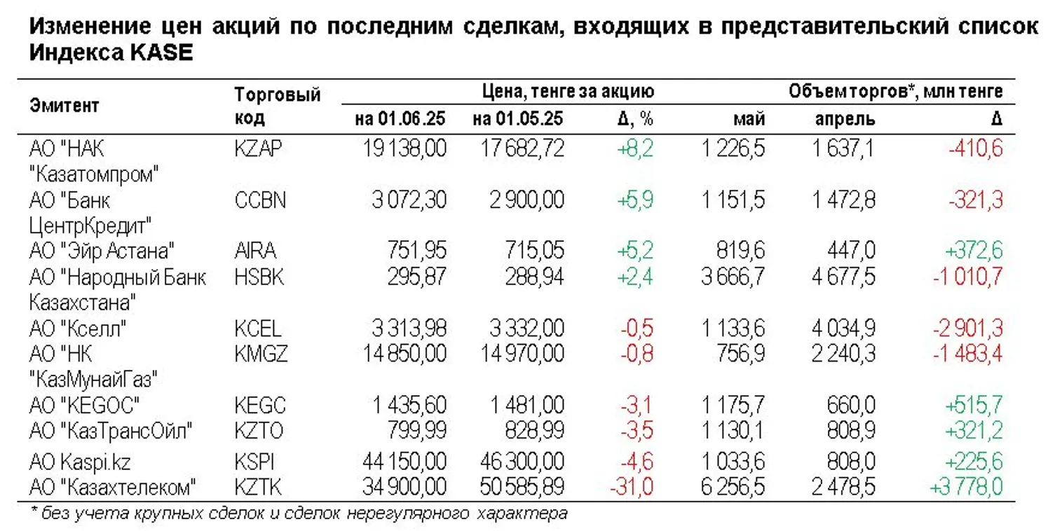 Лидерами роста среди индексных акций по итогам мая являются простые акции АО «НАК «Казатомпром», которые прибавили в цене 8,2%. Годовое общее собрание акционеров компании утвердило размер дивидендов за 2024 год на сумму 327,9 млрд тенге или 1 264,12 тенге на одну простую акцию. Второе место в списке лидеров занимают простые акции АО «Банк ЦентрКредит», которые выросли на 5,9%, до 3 072,30 тенге за простую акцию. Тройку лидеров замыкают простые акции АО «Эйр Астана» с ростом 5,2%. Годовое общее собрание акционеров компании утвердило размер дивидендов за 2024 год на общую сумму 19,1 млрд тенге или 53,7 тенге на одну простую акцию. По финансовым и операционным результатам компании за первый квартал 2025 года общая выручка и прочие доходы выросли на 10,4%, до 292,4 млн долларов, по сравнению с аналогичным периодом 2024 года. Показатель EBITDAR вырос на 37,1%, до 59,9 млн долларов. Маржа EBITDAR увеличилась на 4,0 процентных пункта - до 20,5%.