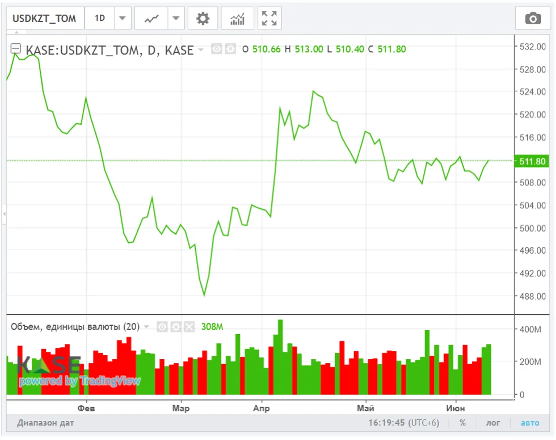 По итогам торгов четверга курс по паре USD/KZT вырос до 511,70 тенге (+3,97 тенге) при объеме торгов в 308 млн долларов (+18 млн). Напомним, что на стороне спроса в середине года традиционно выступают активный сезон отпусков и ускорение освоения бюджетных средств (рост импорта товаров) вкупе с необходимостью обслуживания внешних обязательств. С другой стороны, снижение объёмов конвертации инвалюты из Нацфонда (с 988 млн долларов в мае до 700-800 млн в июне) снижает предложение инвалюты на рынке.
