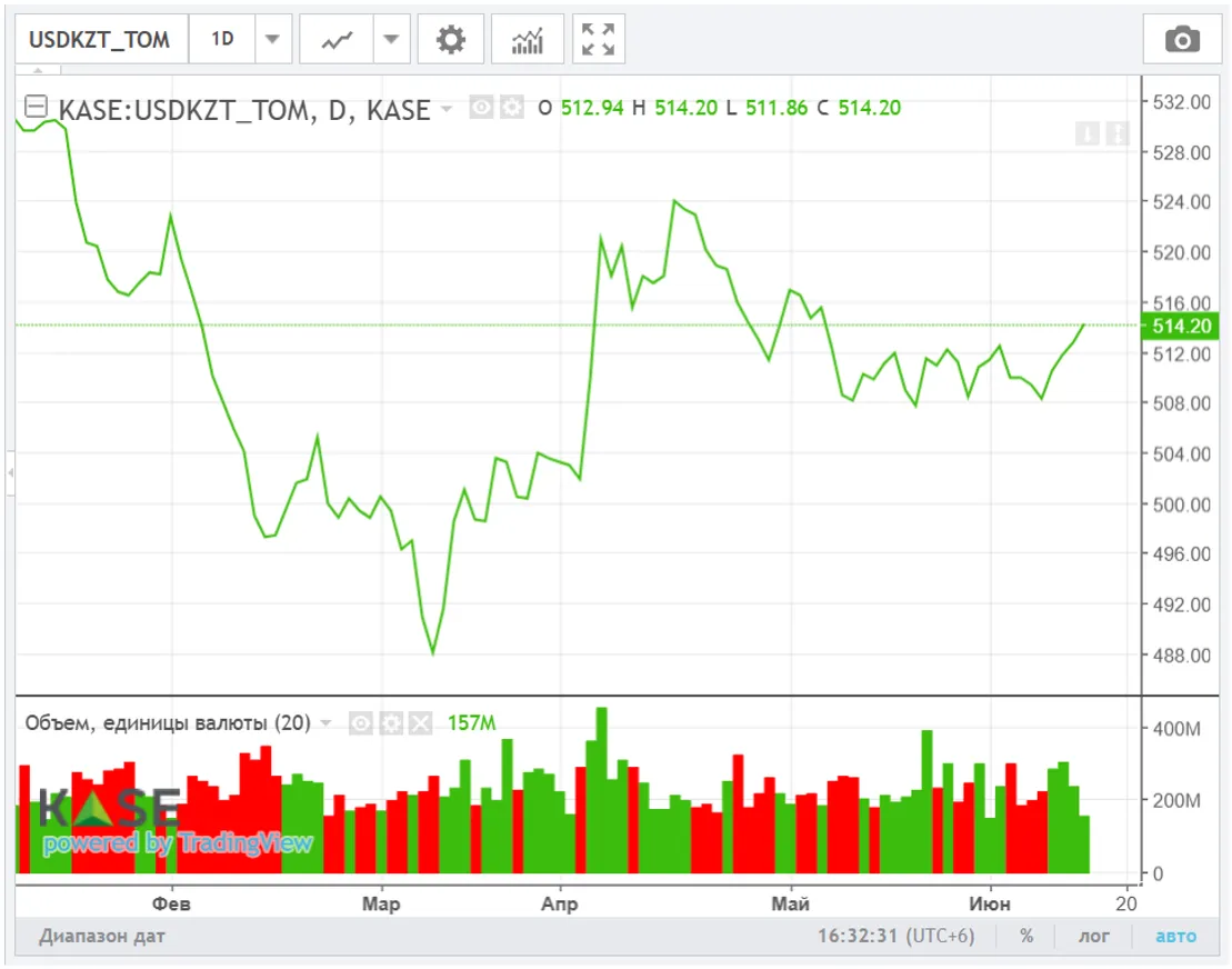 По итогам торгов в понедельник курс по паре USD/KZT незначительно вырос — до 512,60 тенге за доллар (+0,50 тенге). Напомним, что в середине года традиционно наблюдается повышенный спрос на иностранную валюту, обусловленный ускорением освоения бюджетных средств (что ведёт к росту импорта товаров). Среди внешних факторов, оказывающих давление на нацвалюту, следует отметить коррекцию цен на нефть и геополитическую напряжённость в регионе.