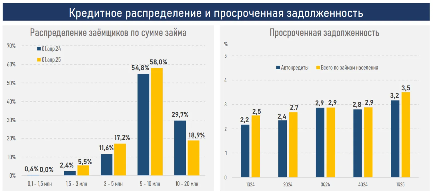 Благодаря более ускоренному росту автокредитования (выдача новых займов населению за 3М25 выросла на 9%) его доля в выдаче розничных кредитов увеличилась до 12,7% с показателя в 10,2% годом ранее.