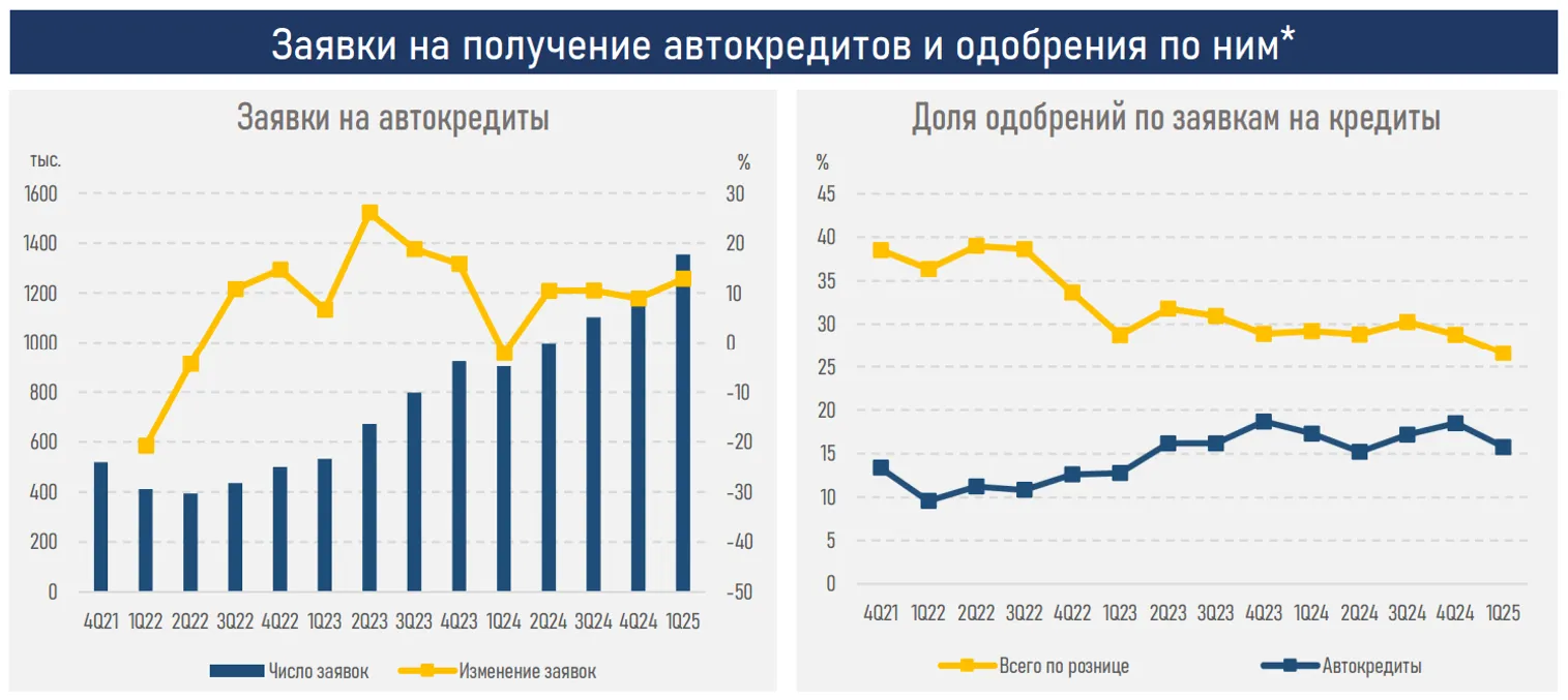 На рынке автокредитования в первом квартале 2025 года продолжился уверенный рост на фоне значительного увеличения количества заявок (за 3М25 – 1,4 млн), что отражает устойчивый потребительский интерес к приобретению автомобиля в кредит и возможность его использования в коммерческих целях.