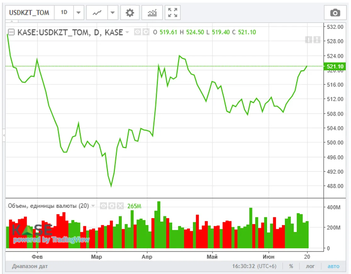 Курс по паре USD/KZT седьмой день подряд демонстрирует восходящую динамику и вырос в пятницу до отметки 521,92 тенге за доллар (+2,27 тенге) при объёме торгов в 265,1 млн долларов (+16 млн долларов). Ослабление нацвалюты во многом связано с внутренними факторами спроса и предложения инвалюты. Спрос на инвалюту, вероятно, был обусловлен оплатой казахстанскими компаниями импортных контрактов на фоне ускорения освоения бюджетных средств, реализации крупных инвестиционных и инфраструктурных проектов, погашением и обслуживанием внешнего долга государственным и частным секторами экономики, прохождением активного сезона отпусков. В то же время в июне объёмы трансфертов из Нацфонда снизятся до 700-800 млн долларов против майского показателя в 988 млн долларов. Среди внешних факторов отметим снижение котировок нефти в ходе торгов на KASE наряду с укреплением индекса доллара, что могло оказать дополнительное давление на курс тенге.