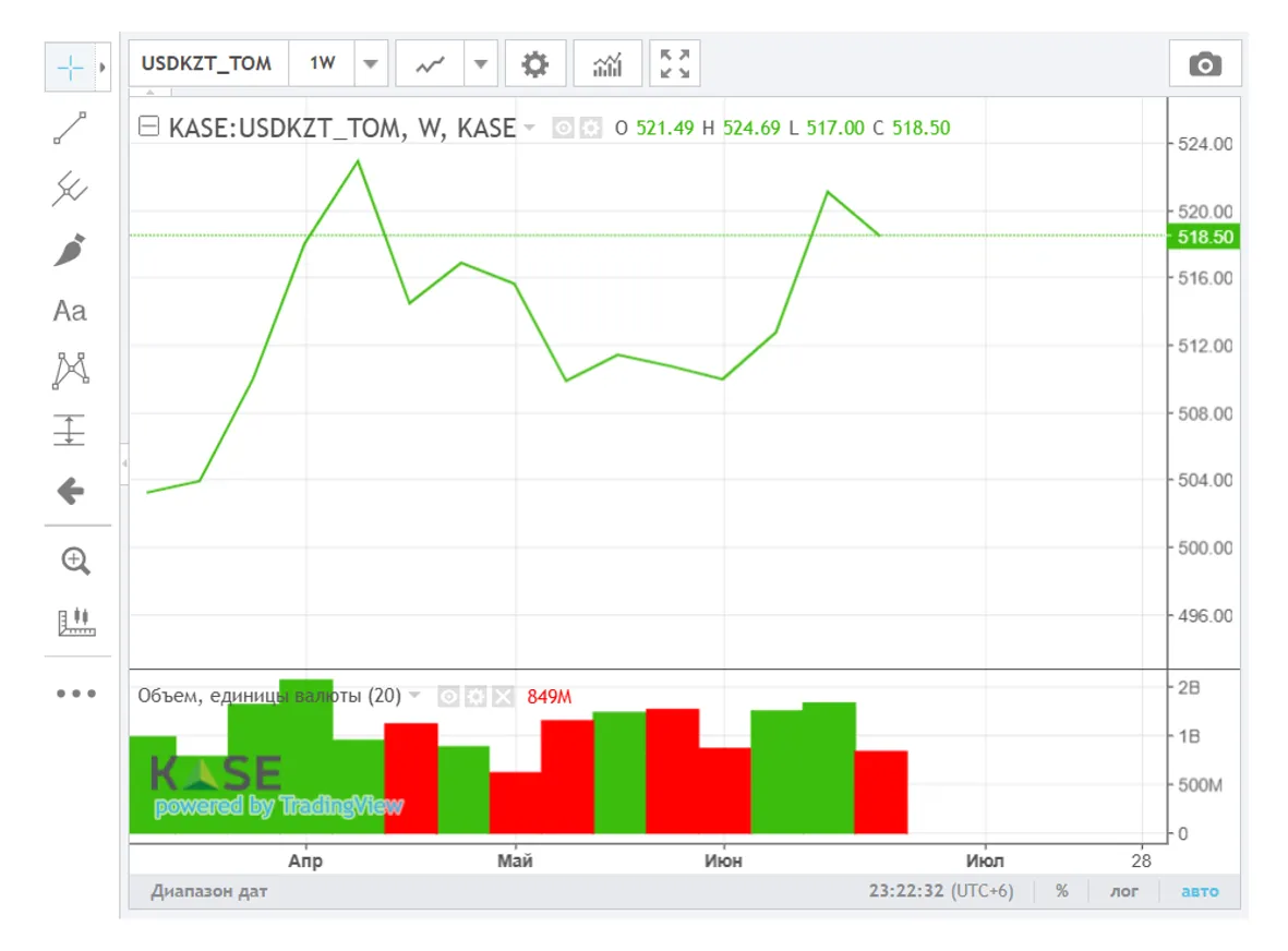 За торговую неделю нацвалюта укрепилась на 3,07 тенге. В понедельник, 23 июня, средневзвешенный курс на 15:30 сложился на уровне 523,46 тенге за доллар. В пятницу, 26 июня – 520,39 тенге за доллар.