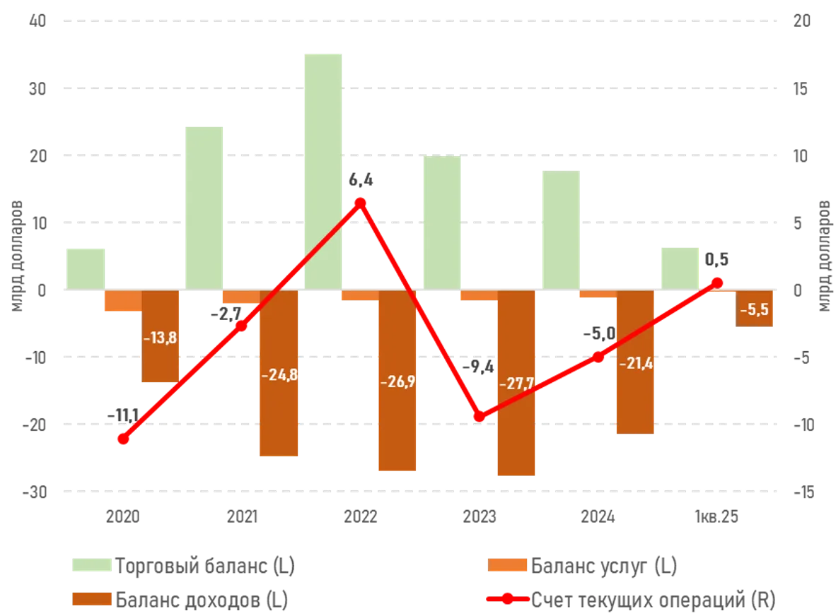 Между тем в первом квартале 2025 года текущий счет сложился с профицитом в 502 млн долларов (-46 млн в 1кв24г.). Улучшение произошло благодаря более быстрому росту экспорта товаров (+3,4%) по сравнению с импортом (+1,1%), а также снижению выплат по первичным доходам (-3,1%).